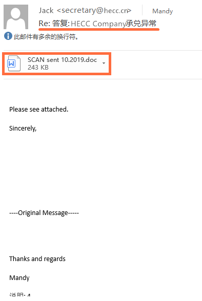 下圖為263企業(yè)郵箱反垃圾網(wǎng)關(guān)識別并隔離出的一封“商貿(mào)信”釣魚郵件,該郵件乍看之下只是一封正常票款確認(rèn)郵件,并且是基于原郵件溝通的答復(fù)郵件,但其實(shí)發(fā)件人的郵箱已被黑客盜取,郵件所含附件是被黑客掉包的誘餌文檔。